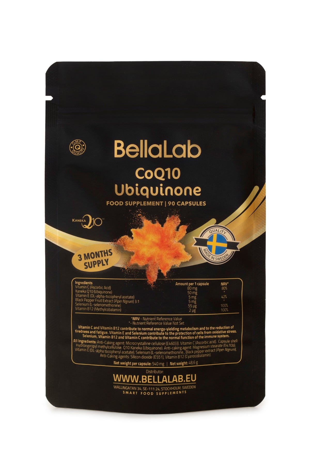 L-askorbīnskābe, lipīgumu regulējoša viela taukskābju magnija sāļi, ubihinons, celulozes pildviela, lipīgumu regulējoša viela silīcija dioksīds, DL-alfa-tokoferilacetāts, melno piparu (Piper nigrum) ekstrakts, L-selenometionīns, metilkobalamīns