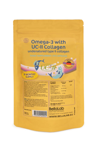 Uztura bagātinātājs — BellaLab Collagen B2Cool 20 mg + Bosvēlijas ekstrakts, dabisks (nedenaturēts) II tipa kolagēns-, kas tiek iegūts novistas krūtiņas kaula.Nedenaturēts - nozīmē, ka II tipa kolagēna molekulārā struktūra paliek sākotnējā trīskāršās spirāles struktūrā, kā tas ir dzīvnieka ķermenī, pat pēc tā ekstrakcijas.Bosvēlijair viens no pasaulē labi zināmajiem un plaši izmantotajiem ārstniecības augiem. Skābei, ko tā satur, ir pretsāpju, pretiekaisuma un nomierinoša iedarbība.